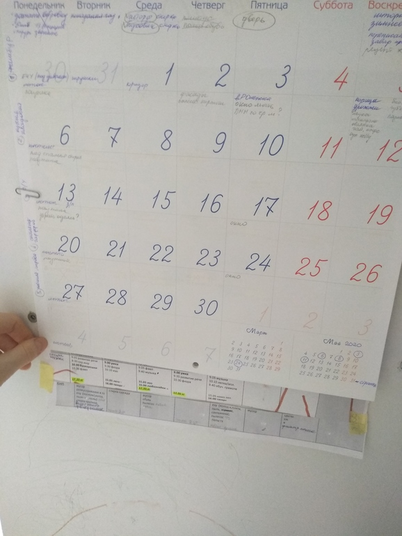 Журнал дополняет календарь.Пока использую такой, висит на кухне. Сейчас полупустой,т.к.дома сидим, обычно пишу что с собой взять, запись к врачу, заехать в магазин,забрать заказ и т.д.Внизу распечатано расписание занятий, кружков, и БНП.