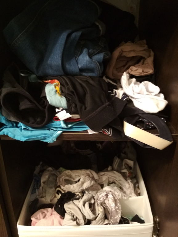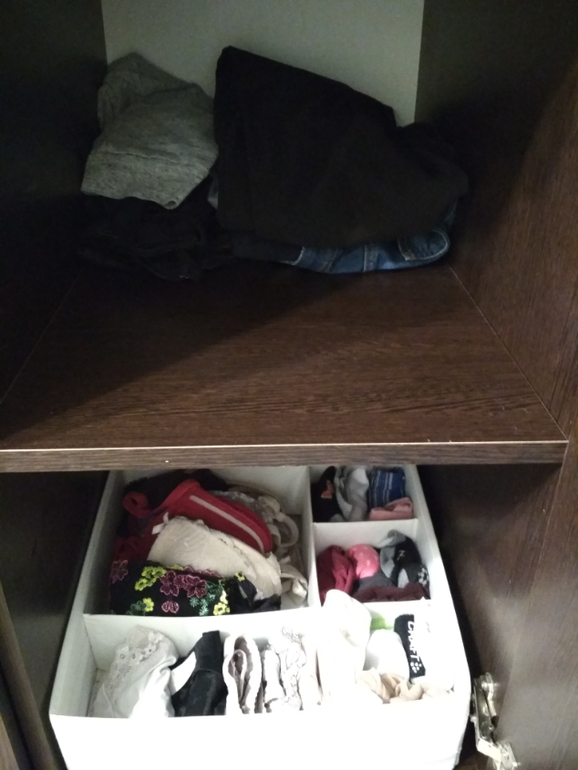 Я включив таймер на 15 минут разобрала свою одежду и нижнее белье (ух, завалила я всю полку), убрала во что уже не влезаю в связи с округлившимся животиком и также собрала кучку на выброс.