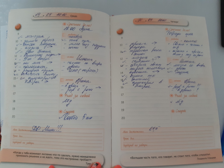 у меня сейчас небольшой блокнот на пружинке. Пишу список дел, покупки, записи на прием. После неактуальный лист вырывается и выкидывается.