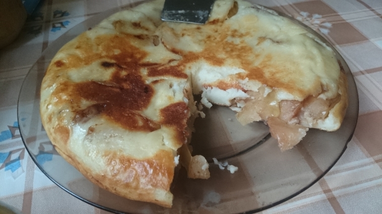 Отличный десерт за 10 минут, в нашем случае вариант завтрака в выходные чаще всего Меня радует то, что не надо греть духовку и выпекать целый час. Все просто Яблоки обжарить на сковородке ( я с сахаром и корицей делаю) до момента,пока они станут мягкими. Потом залить любым блинным тестом. закрыть крышкой, чуть подождать, перевернуть и еще немного подождать. Все! Готово. Можно сахарной пудрой посыпать. Всем нравится) я делаю блины на молоке, так что с кефиром не пробовала.____Из освоения яиц рулет из индейки.