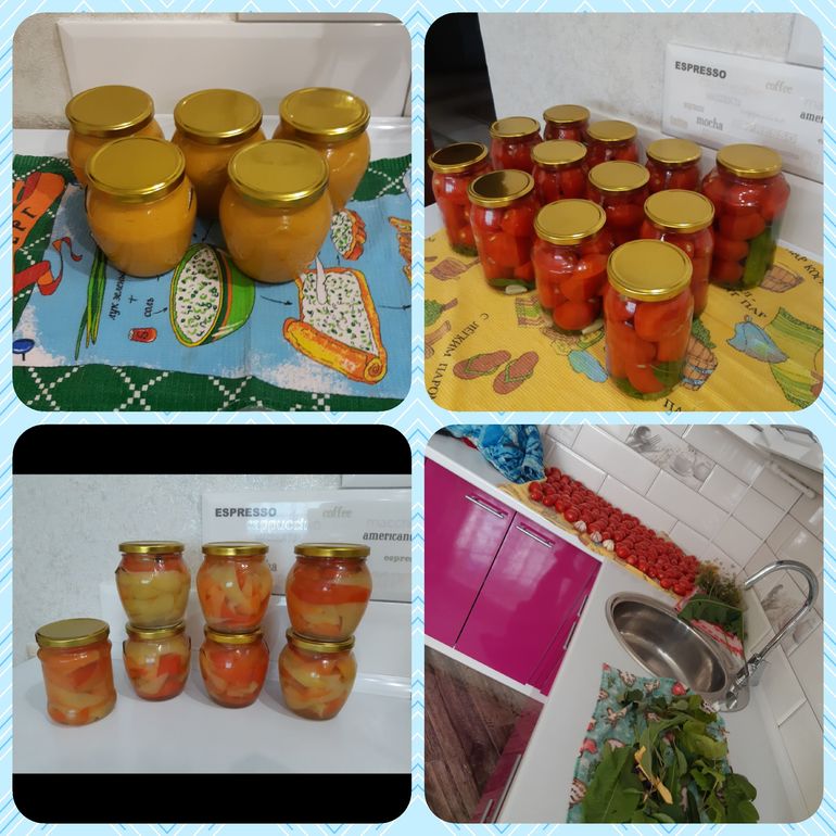 Стерилизую все в духовке - и быстро и минимум трудозатрат. Сегодня купила еще 20 банок. И вечером уже притащила 5 кг перца , 3 кг баклажан, моркови т.д. МойДжо ждет меня, правда, решила уже на завтра отложить)))