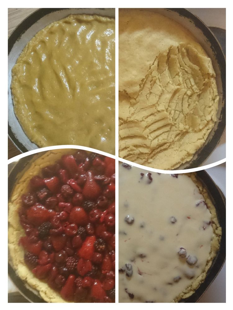 Вынимаем и ложкой делаем бортики, сдвигая корж к краю формы. Выкладываем 400 грамм любимых ягод или их ассорти, сверху заливка - перемешиваем 1 яйцо, 70 грамм сахара и 250 грамм сметаны