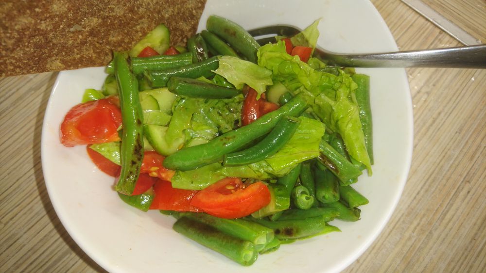 Второй любимый салат с обжаренной стручковой фасолью, хорош как теплый, так и остывший, заправка - оливковое масло, лимонный сок, соль и перец