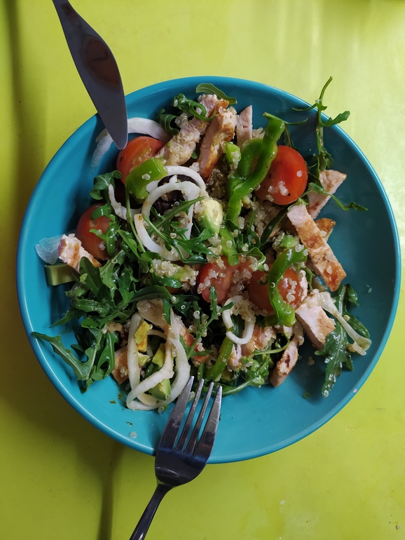 🥑 собрать салат: нарезать помидор и грудку ломтиками, перец и лук кружочками, добавить теплые баклажаны, рукколу, моцареллу и ложку теплого киноа. Заправить и слегка перемешать.