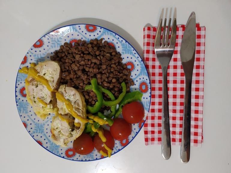 🍗 Намазать творогом, посолить, положить сыр и закрутить в рулет. Обернуть фольгой и запекать в духовке при 200°С 30 минут.