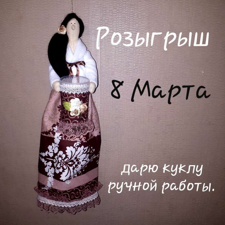 Уже весна, скоро Женский день! К этому празднику я подготовила куклу ручной работы, и 8 числа хочу разыграть ее.