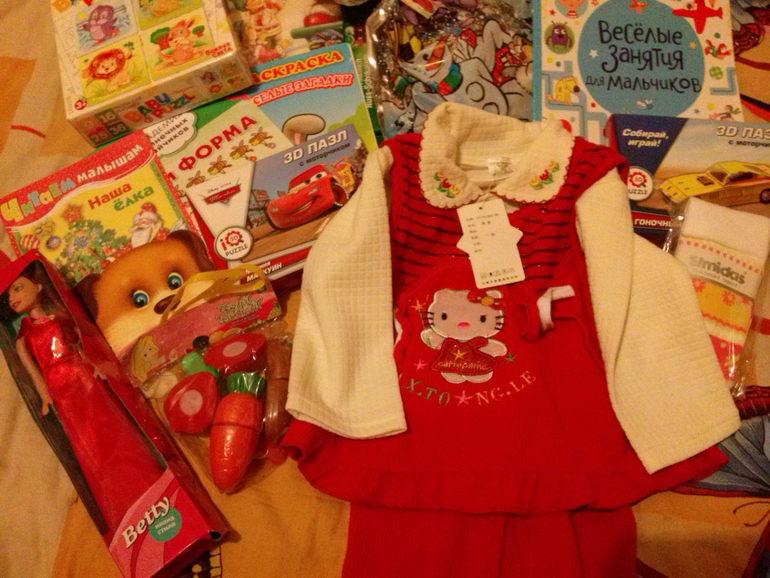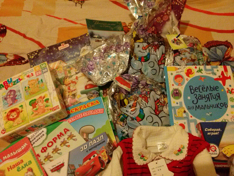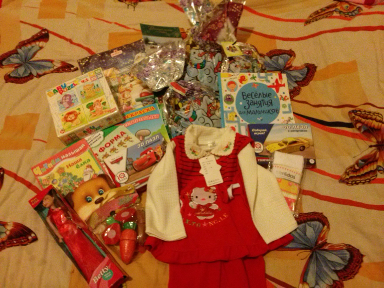Дети в восторге!!!!!!!!Для каждого ребенка был пакетик подписанный и в нем много всего)))Не забыли и о родителях)))Дорогие снегурочки,счастья вам в новом году,здоровья,чтобы ни в чем не имели нужды!!!!!Ну и хвастик)
