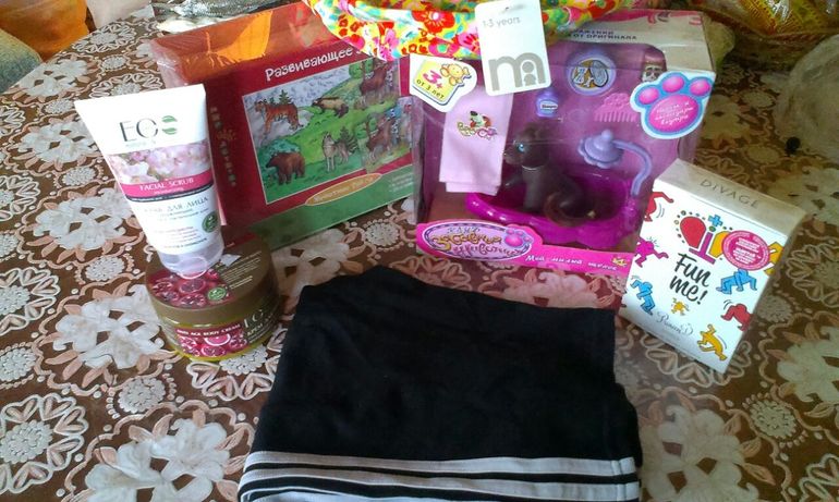 Ангелиша сразу потребовала отцепить этикетку от панамы (она офигительная) и распаковать ей коробку с барбосом. Всё сложила в корзинку и ходит с ней повсюду. Даже в кровать с собой берёт :) Лото пока убрали - ещё соображалки не хватает. Велосипедки Лизе прямо в аккурат. Бабушка нацелилась на водичку и крем. Мне достался скраб - ты как знала, что у меня закончился :)