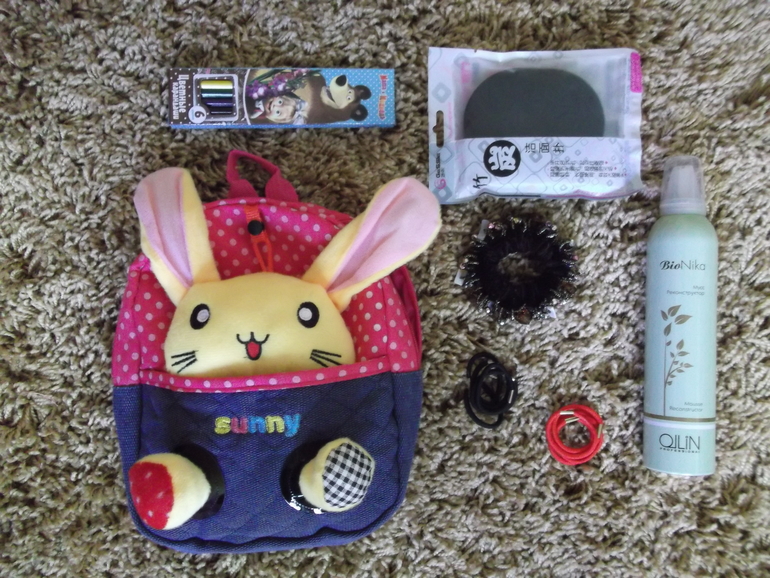 Итак, резинки для волос для мамы и дочки, набор цветных карандашей, бамбуковый спонж для умывания лица, мусс-реконструктор Бионика и рюкзачок. Зверик из кармашка рюкзачка вынимается. Им можно играть, а в рюкзачок можно садить любые игрушки подходящего размера.