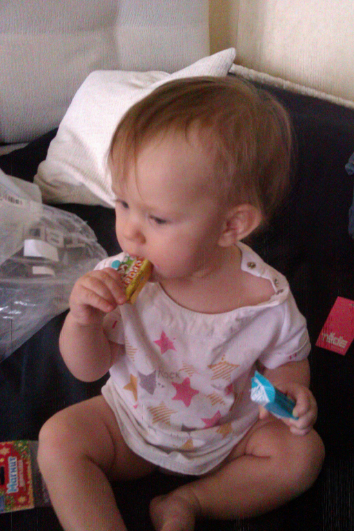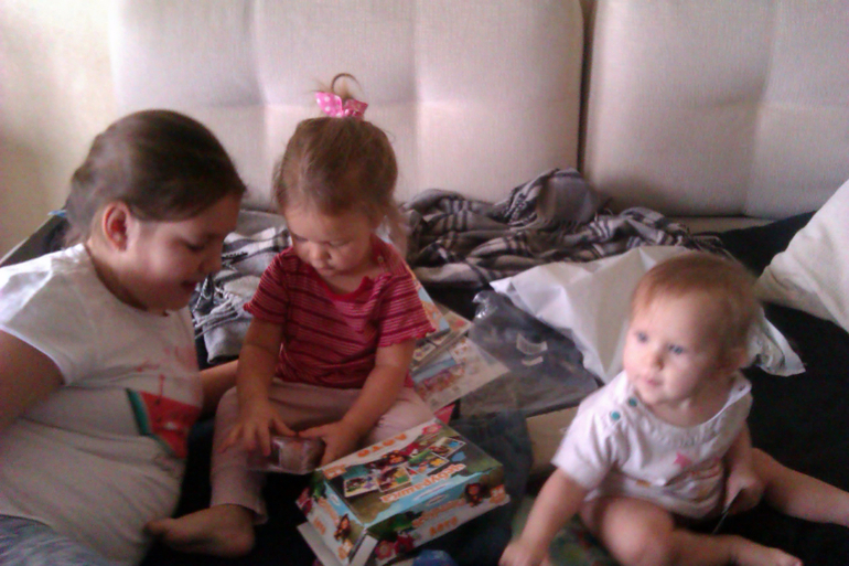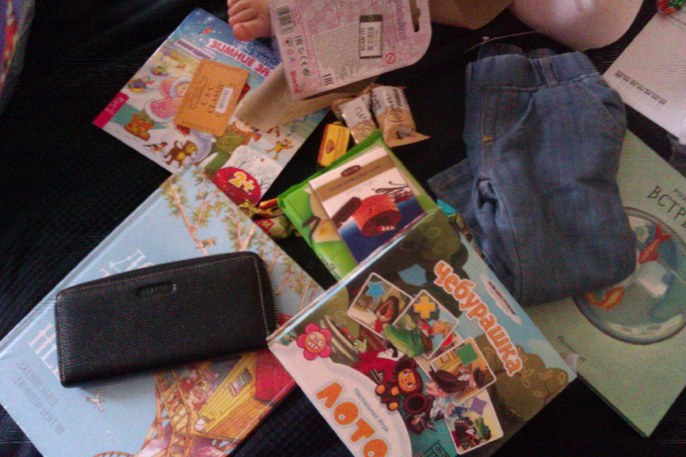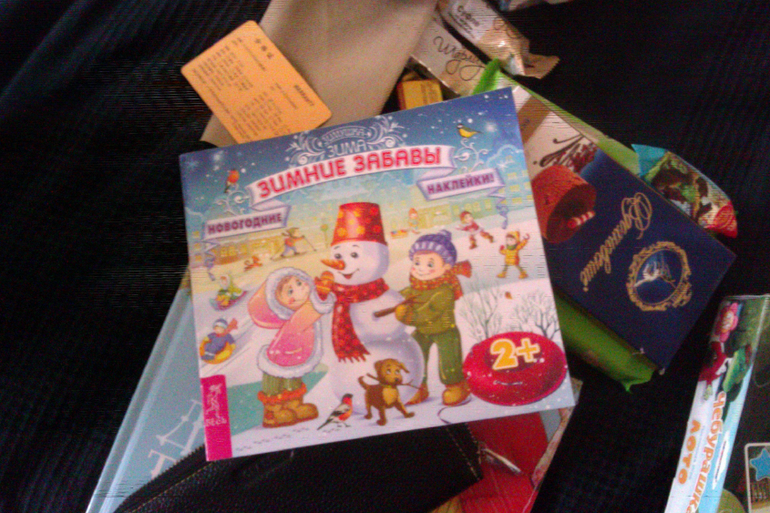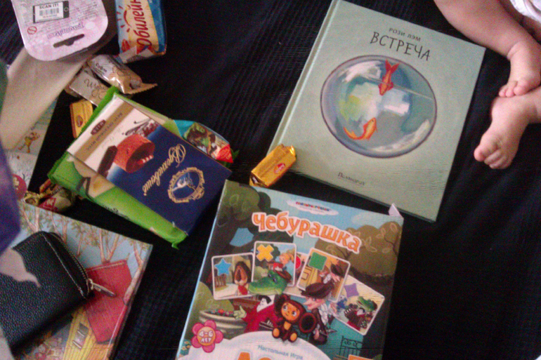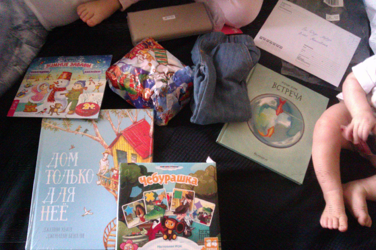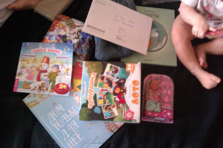 Все подарки нашли своих почитателей и обладателей!! Причем так быстро все распечатывалось и растаскивалось, что я еле успела сфотографировать на память. Кошелек забрала дочка мужа от первого брака. Кукла была сразу распечатана, накормлена и спать заботливо уложена Ярославой (средняя моя дочка 1,10), наклейки тоже уже ею наклеены. Джинсы как раз на весну младшей Агате будут. Книги вообще изумительные. Иллюстрации очень красивые, я тоже люблю книги и люблю красивые книги, но такие, вернее это издательство еще ни разу не встречала. Лото очень интересное, мы как раз сейчас фигуры и цвета с Ярославой разбираем. За сладости тоже огромное спасибо)) Ярославе шоколадные конфеты пока не даю, так она сразу же печенье схватила. А открытка с поздравлениями останется на долгую память!! В общем огромное Вам спасибо и желаю всего самого хорошего всей Вашей семье. Благополучия и исполнения всех Ваших желаний!