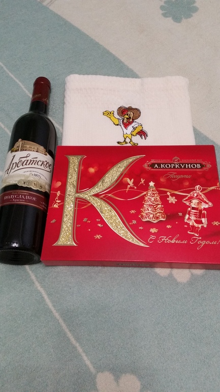 ЦЕПОЧКАВыиграла я у Ирины замечательный подарочек!Спасибо огромное)Пока жду подарочек,предлагаю свой подарок:Бутылочка столового вина,коробочка конфет и полотенце с символом 2017 года (Петушок)