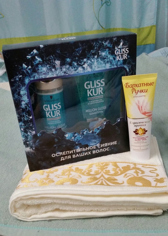 ЦЕПОЧКАЗдравствуйте, я выиграла у замечательной девушки Анны.Пока жду свой подарочек,продолжаю цепочку и предлагаю свой:Набор для волос восстановление и блеск,махровое полотенце с золотой вышивкой 50 на 80 см и крем для рук.