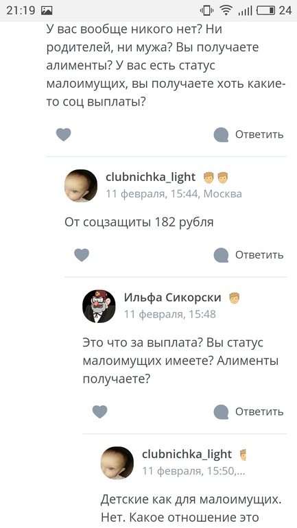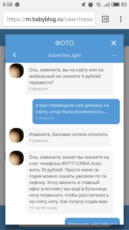 Многое отскринить не успела,но поверьте на слово!Тут она неохотно отвечает на вопросы о семье и пишет,что родни нет,только она и сын,муж умер,но там был благополучный дневник,где есть мама 37 лет,муж другой с зп выше 60 000,и...она беременна!Сейчас дневник пестрит словами,что уволилась,сочувствующие кидают денег,а судя по сроку,скорее всего наступил отпуск по БиР,ежедневно однотипные посты,чтоб чаще попадать в ленту и привлекать внимание!Есть кв,которую сдавать ей невыгодно с ее слов и многое другое..Вообщем,прочтя этот текст,подумайте,стоит ли ей помогать и не мошенница ли она,очень много несостыковок.Дневник на бэби.ру видела не только я.