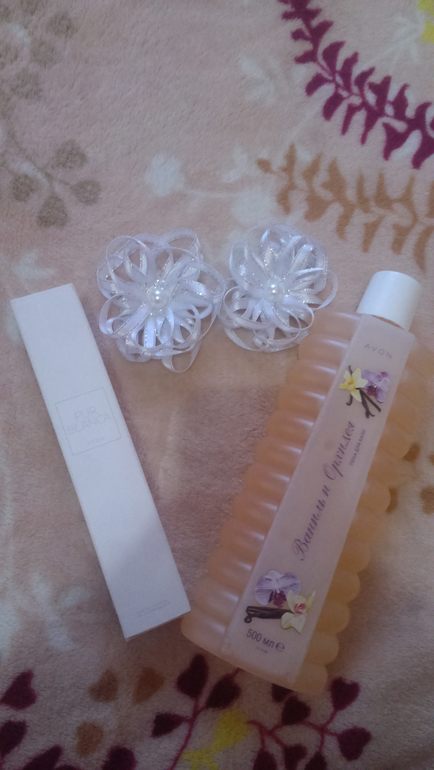 Удача вновь улыбнулась нам и мы продолжаем цепочку. Пока ждем свою от Екатерины,хотим предложить свои скромные подарочки. Предлагаю две заколочки,пену для ванны и туалетную воду Pur Blanca(без слюды).