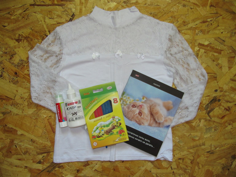 Картон белый, цветная бумага односторонняя, цветная бумага двусоронняя, клей ПВА, клей карандаш, восковой пластелин. Тетради: с кошечкой в клетку 48 листов, с цветами 2шт. 18 листов в клетку, с кошками-собаками 2шт. 12 листов в клетку, с Ам-нямом 2шт. вклетку 12 листов. Конечно, положу вкусняшку)