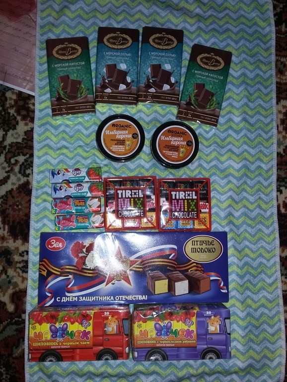 Огромное Спасибо!Позавчера, в канун праздника и в последний день работы почты, а точнее- в ее последние 4 минуты работы, я добилась, чтобы мне открыли заранее закрытую дверь и получила посылку! Из далеееекой Амурской области от Нины! 🎁💌Содержимое посылки очень удивило и порадовало всех нас! Столько вкусняшек! Шоколад с морской солью и морской капустой! Скажу честно- мы трепетали в предвкушении)) Дегустацию не стали откладывать и поспешили заварить вкусный чай из этой же посылочки!