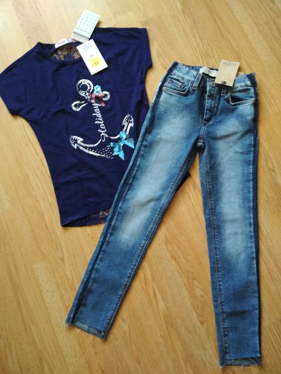 футболка сзади гипюровая спинка 199. джинсы 299, были бойфренды на Анюту за 250. инга раскритиковала рисунок. В основном у нас выбор был большой на девочек от 8-10 лет. Очень много джинс, брюк, от 250 до 399 руб.