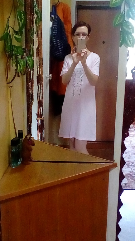 Про платье. Размер L. На мне вот так. Ношу 44 размер, 173 см рост. Оно мне хорошо, свободненько. Так что кто более аппетитных форм, то вполне можно.))