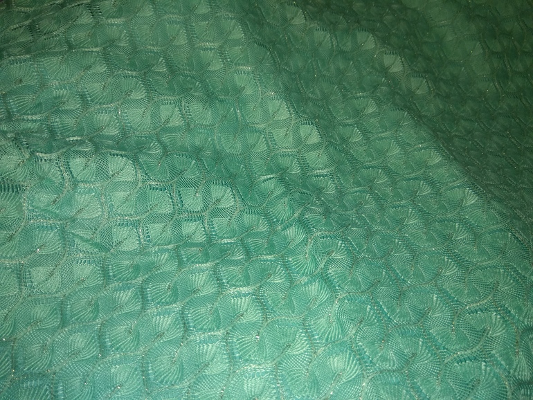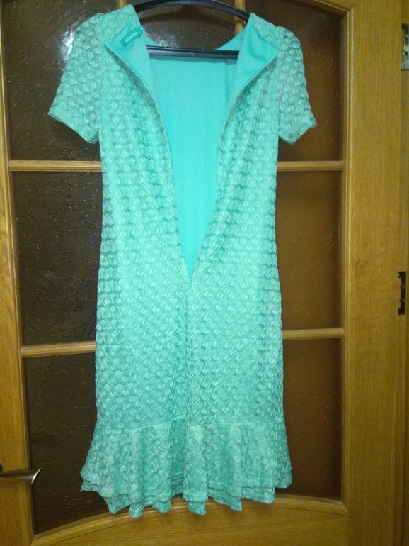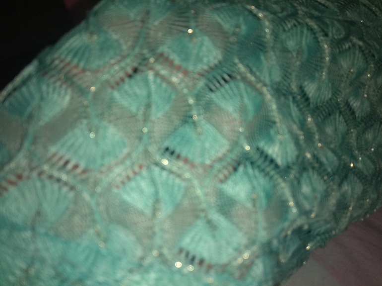 приятного мятного цвета с золотинкой. Верхняя часть - кружевной трикотаж. Внизу - чехол непрозрачный.