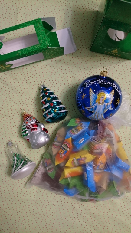 Ёлочные игрушки и конечно сладкое, ассорти коровка из Вольска! У меня уже настроение праздника!А у вас?