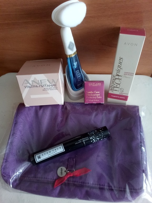 Косметичка+ Крем для лица Avon Anew «Ультра питание"+ Специальное смягчающее средство Oriflame Tender Care с ароматом черной смородины +Щетку для очищения лица "POBLING SONIC PORE CLEANSING"+ тушь Аvon true colour+ Сыворотка для волос Avon Advance Techniques "Гладкость и блеск" с протеинами шелка.