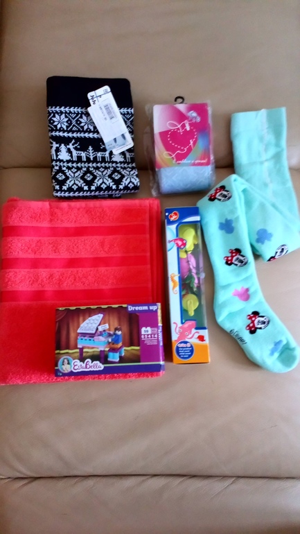 Выйграли мы в цепочке 1у Елены из Костромы. Продолжаю вот таким подарком. Лосины тёплые размер 104-122, колготки 116-122, колготки тёплые 104-116. Набор конструктор и набор рыбалка. Для мамы пляжные шлепки размер 36-37 и полотенце.
