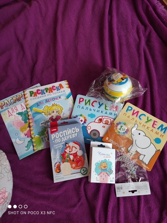 , моим деткам прислала раскраски, много раскрасок. Теперь им будет, чем заняться на каникулах. Вове мячик, он их обожает! На елочку украшения, очень красивое! Роспись по дереву для Саши, она очень любит рисовать!! И для всей семьи игру, будем тихими зимними вечерами играть! Спасибо тебе огромное!!!!!