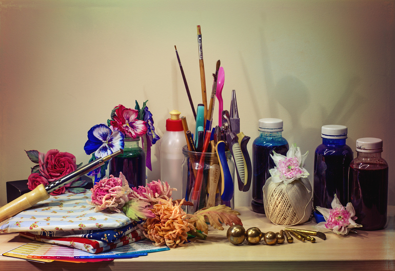 Ну вот и я попробовала чудо-кисть. Фонарика не было и мне пришлось воспользоваться встроенным на телефоне. Получилось как-то так)) Для композиции использовала свой рабочий инвентарь и цветы которые им делаю. Обработка: немного ФШ.