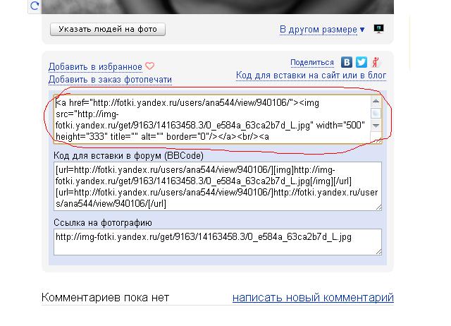 закачиваешь сначала туда, потом выбираешь нужное фото нажав на него мышкой, ниже есть ссылка "Код для вставки на сайт или в блог"-красным выделила