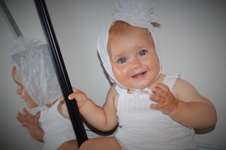 Первое отличное. Второе не нравится, черный ствол из головы, горизонт режет головку. Со вспышкой снимали? Третье не нравится по той же причине — вспышка портит кадр, плюс по коленке отрезали. Идея с зеркалом не совсем мне понятна в данном случае. На четвертой что снимали ручку? Только она в резкости и в большей степени притягивает взгляд. Извините, если обидела критикой. Но малышка у Вас чудо просто! Очень выразительные глазки:) показывайте нам ее еще.