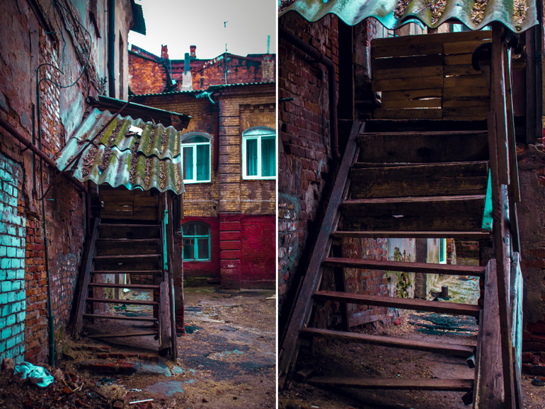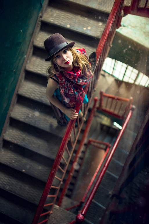 1. Нашли мы подъезд с сумасшедшей лестницей. Жаль у меня не было вспышки и на улице была ужасная пасмурная погода. Пришлось выкручиваться и задирать исо. Приемы - съемка сверху, спираль и диагонали в кадре. Ну и все это еще можно вполне отнести к ростовому портрету.