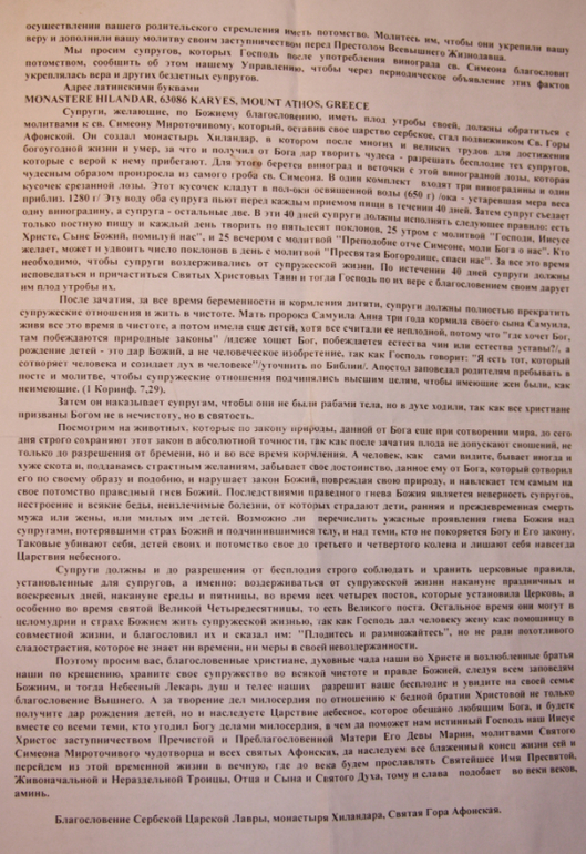 Сам того не зная, мой муж попал в один из афонских монастырей Хиландар (единственный сербский монастырь на Афоне). Где ему дали небольшой пакетик, содержащий инструкцию (см. приложение к письму) и то, о чем в ней написано. Прочитай ее внимательно и до конца.