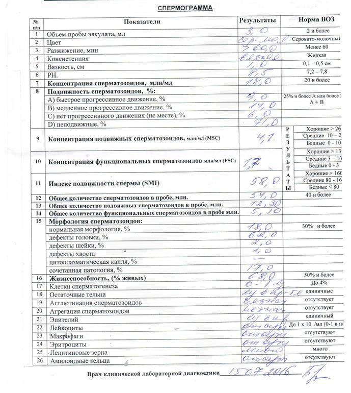 У нас немного другая ситуация была. Показатели все в норме были, но лейкоцитов больше нормы. Выписали лечение. Так после него показатели которые были в норме стали ухудшаться! А лейкоциты так и остались без изменений. Короче муж бросил ходить к тому андрологу. Просто я веду к тому, что когда не видите результатов, нужно менять врача.