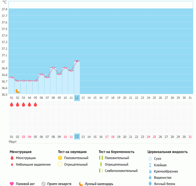 кстати, у меня после менструации температура довольно долго держится "в серединке" - между первой и второй фазой, а потом снижается и держится довольно низкой до овуляции. При этом и эндометрий нормальный, и фолликул до 19-25 мм, просто цикл длинный за счет первой фазы