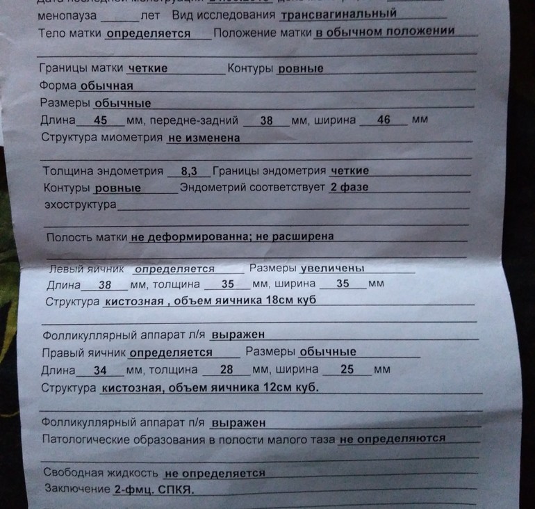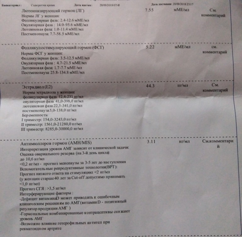 Спустя 2 года отдыха от врачей пошла сдаваться в жк. К специалисту по бесплодию. Черт меня дернул... Принесла ей кучу анализов, узи за последние 2 года, включая последние гормоны и узи. 3 года назад мне сняли диагноз СПКЯ и оставили МФЯ. Бросила пить таблы и цикла снова нет. Была на узи на 58 дц и на 68 на приеме у врача. Разница офигеть. В итоге узнав,что я по бесплодию врач ставит мне первичное бесплодие и говорит собираться на эко. Дала направление мужу на СГ и мне к гинекологу в тубдиспансер. И все. Сама сдала анализы на 4 дц. Амг же в норме? По анализам СПКЯ НЕТ. Узи отдельный разговор. Намерили мне яичники... Девочки, гляньте. Я уже все напрочь забыла.