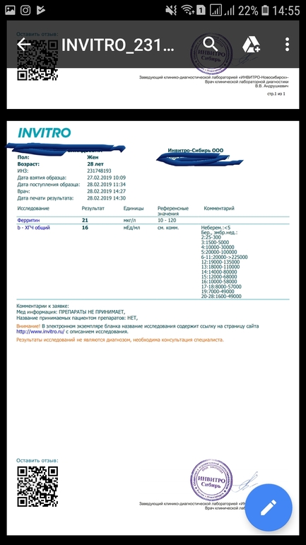 Я сегодня консультировалась с гематологом. Она подтвердила анемию скрытую. А я кстати по вашему совету купила тогда сорьифер. И пью, и вот гематолог тоже сказала что он подходит)))) вот пишу что б сказать спасибо)))