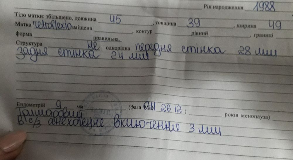 Ендометрий 9 мм , анехогенное включение 3 мм.