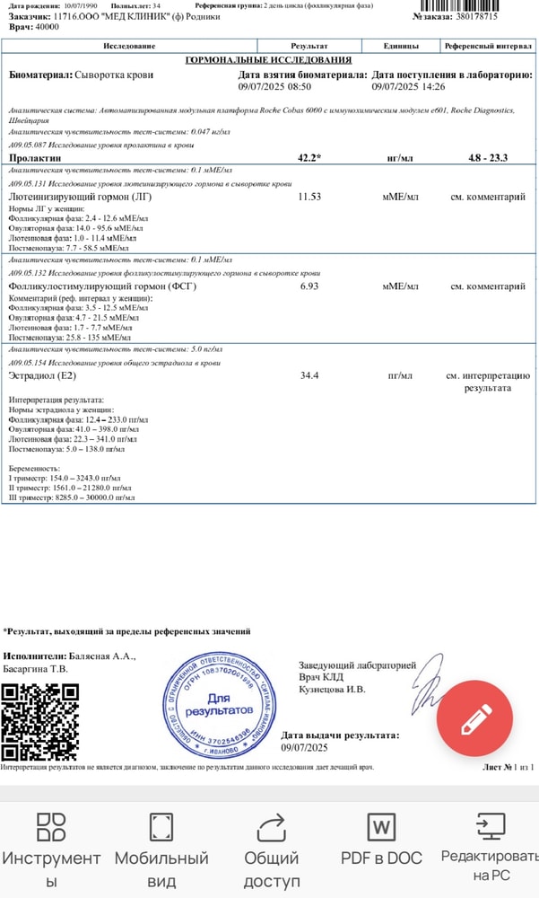 АнализыСлала необходимые гормоны, можно ли с такими показателями забеременеть. Все ли хорошо?( 35 лет)