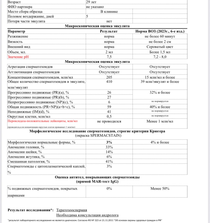 Ульяна Алексеева, изначально был 1%. Но большая часть с дефектами + большой % вообще не подвижных. (Б не наступала больше 1,5 года). Начали лечение. Дефектов стало намного меньше, плюс прибавилось общее кол-во(хорошо так). При этом сдавая последние два раза(в одной клинике), морфология 0%.