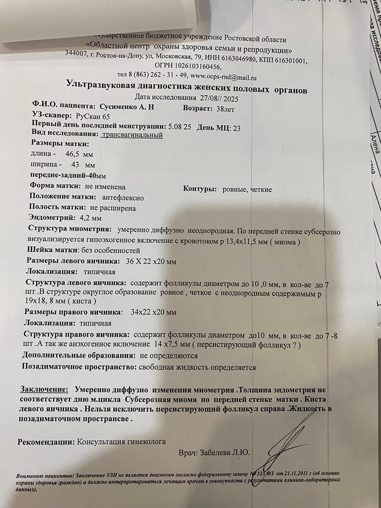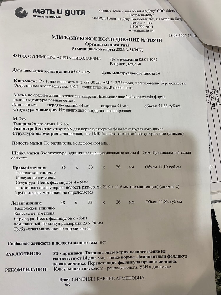 БесплодиеПомогите разобраться, пожалуйста. В первый предстоящий день цикла должна вступить в протокол, но в прошлом цикле (в июле) обнаружена киста правого яичника размерорм 29 мм, пришли критические дни и в этом цикле (август) на 5 день сделала УЗИ- киста увеличилась стала 47 мм, прописали дюфастон и приняли решение пролечить меня капельницами (противосполительно). На 14 дц этого цикла (август) делаю УЗИ - киста правого яичника начала регрессировать стала 21,9 мм, а в левом яичнике доминантный фолликул 23 мм. Продолжаю пить только дюфастон. Делаю УЗИ в этом цикле (август) на 23 дц: киста правого яичника так же регрессировала стала 14 мм, а на левом яичнике где был доминантный фолликул спустя 9 дней получается обнаружена киста 19 мм (я не пойму, фолликул не лопнул а уменьшился и превратился в кисту?) При этом на всех УЗИ у меня эндометрий 3,6 мм (14 дц август), и 4.2 мм (23 дц). Через 7 дней жду месячных чтобы вступить в протокол, но репродуктолог говорит, если будет киста более 10 мм мы не возьмем на эко((( Что со мной? Почему второй цикл подряд нет овуляции, а кисты? И что с моим доминантным фолликулом на левом яичнике, почему он уменьшился и превратился в кисту? УЗИ этого цикла (август) 14 дц и 23 дц прикрепила. Помогите разобраться, понять хоть что-то 🙏🏻🙏🏻🙏🏻
