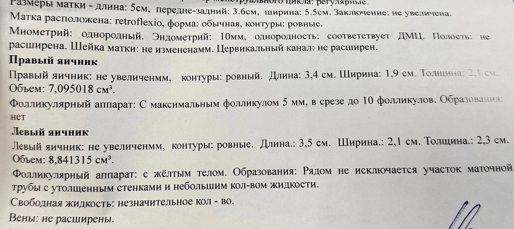 Меня смущает жидкость в малом тазу и написано утолщена труба маточная