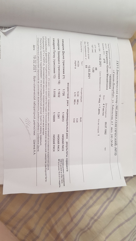 Гинеколог Елена Данилова, Меня пугает вот этот показатель.Трисомия 18 возрастной риск 1:1632 индивидуальный 1:241