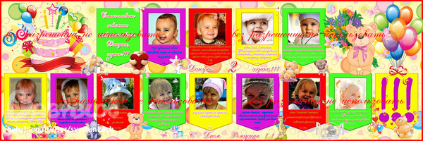 Формат плаката 30 на 90 см. Флажки помечены месяцами от 1 года до 1 года 11 мес. На каждом флажке главные события за месяц.