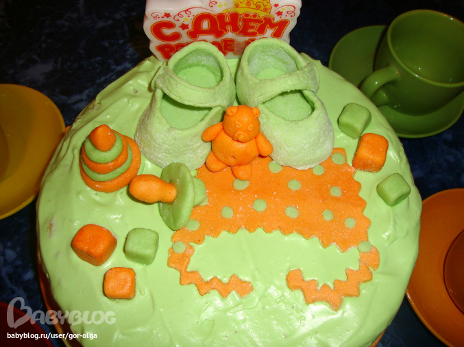 Праздник был позже на два дня после дня рождения, т.к. папа наш был в другом городе на сессии. В сам день рождения мы пригласили на чай - мамочек с ребятишками, с которыми гуляем во дворе. По этому поводу я сама испекла торт. (Я его уже тут показывала - но все равно повторюсь)