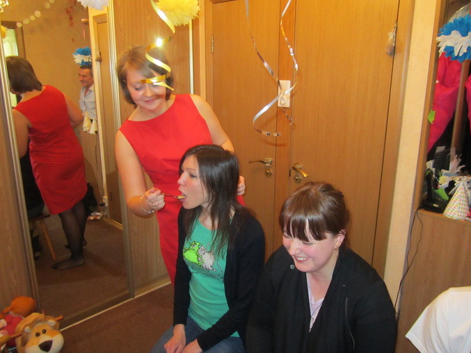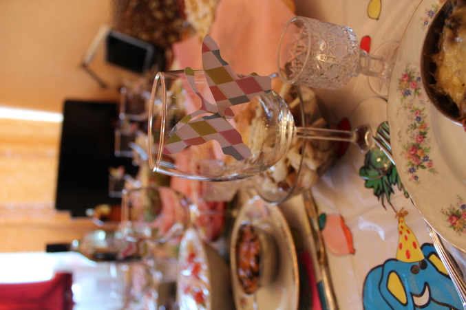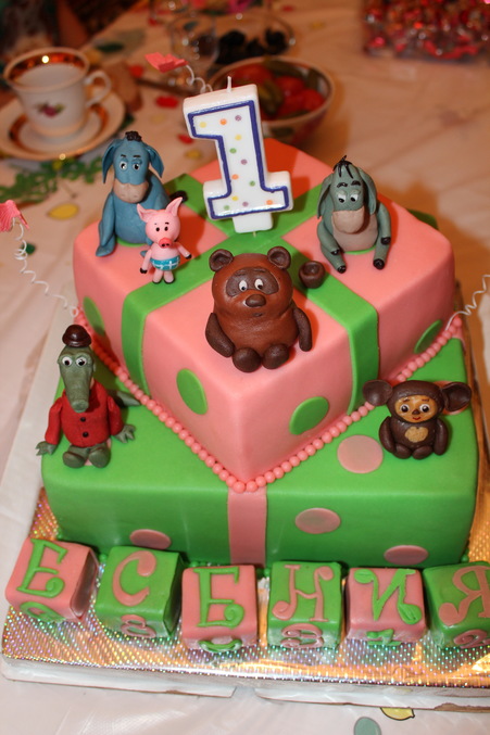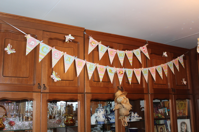 Анна за оформление нашего праздника. Дочурке праздник понравился. Гости довольны и в восторге. Я практически довольна( были, конечно, моменты и косяки)-:) . За столом были загадки и угадывание сказок-перевертышей. Конкурсы у нас были-"кто дальше плюнет соску", " угадай обед Есеньки", "отрежь себе подарок" и за чаепитием делали фигурки из бумаги- даже не ожидала, что все так отлично справятся. Жаль фоток дочи с тортиком нет- ребенок не спал целый день, поэтому просмотр видеоклипа перед чаепитием Есеньку убаюкал. Еще заполняли книгу пожеланий (я делала в нетпринт с фотографиями гостей и стишков) и поздравительную телеграмму. А теперь много фото.