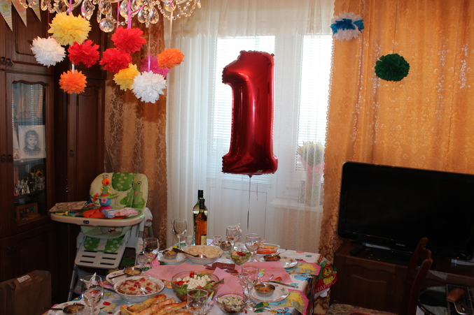 Думать о праздновании начала месяцев за 5. Сначала и родители мои( живем вместе) и муж были против о грандиозном праздновании- " все равно ребенок ничего не запомнит"- говорили они. Но я считаю, что первый день рождения-он самый важный. Да и видео и фото останутся. Спасибо вам, мои дорогие ббешечки, за идеи и уверенность, что я делаю правильно! Спасибо родителям- маме за вкуснейший стол, папе за помощь в оформлении, за помощь в создании помпонов и идеи. Спасибо любимому мужу, который и был в в каких-то моментах против, но, понимая, как для меня это важно, говорил-" заказывай, покупай". -:) И сделал клип. Спасибо