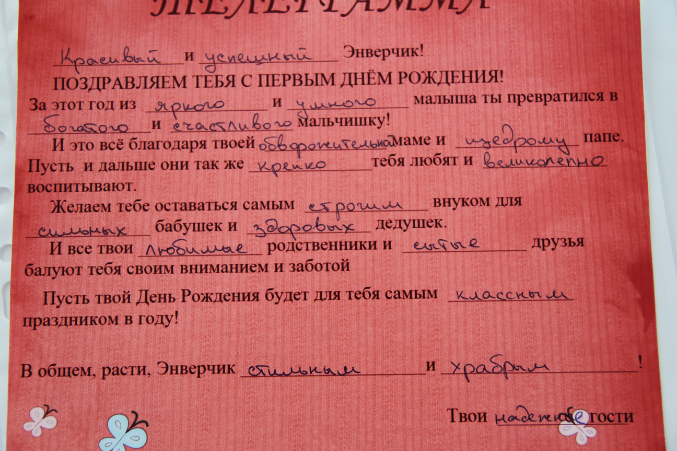 Телеграмму заполнили вместе с гостями, по очереди говорили прилагательные не видев текста)))