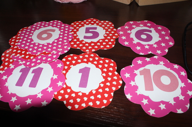 а циферки делала вручную, распечатала нужного размера сами цифры в кружочках, и распечатала шаблон типа цветочка, с волнистыми краями такой, и вырезала их из картона цветного с риснуками