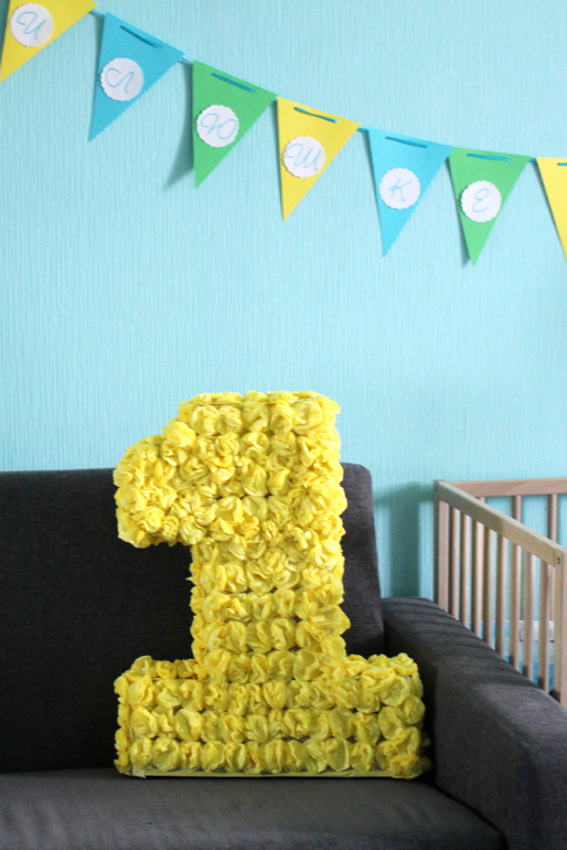 - единичку из желтых салфеток, основу делала из картона от коробки от коляски (СПАСИБО этому сообществу за эту идею!!!!!!)