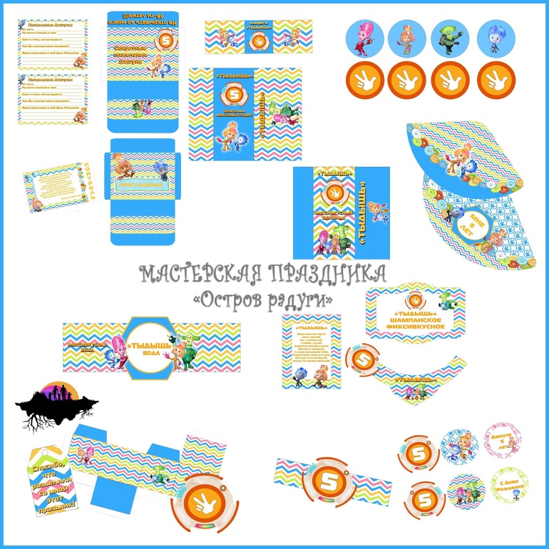 В набор вошли: Поздравительные растяжки, Конверт для пожеланий, Карточки для пожеланий, Приглашения, Конверт для приглашений, Обертка для шоколадка 60гр, Обертка для шоколада 20гр, Обертка для конфет, Наклейки для шоколадных медалей, Колпачок имениннице, Колпачки гостям, Этикетка на воду, Этикетка на шампанское, Пики для украшения закусок, Кольца для салфеток, Бирочка для подарков гостям, Бонбоньерка в форме рюкзочка-помогатора.
